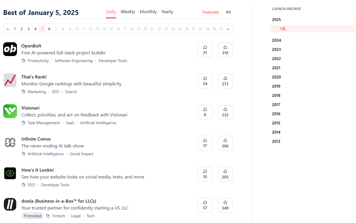 - 매일 가장 인기 있는 제품이 리더보드에 올라갑니다. 이 기능을 통해 현재 트렌드와 흥미로운 제품을 쉽게 확인할 수 있습니다.