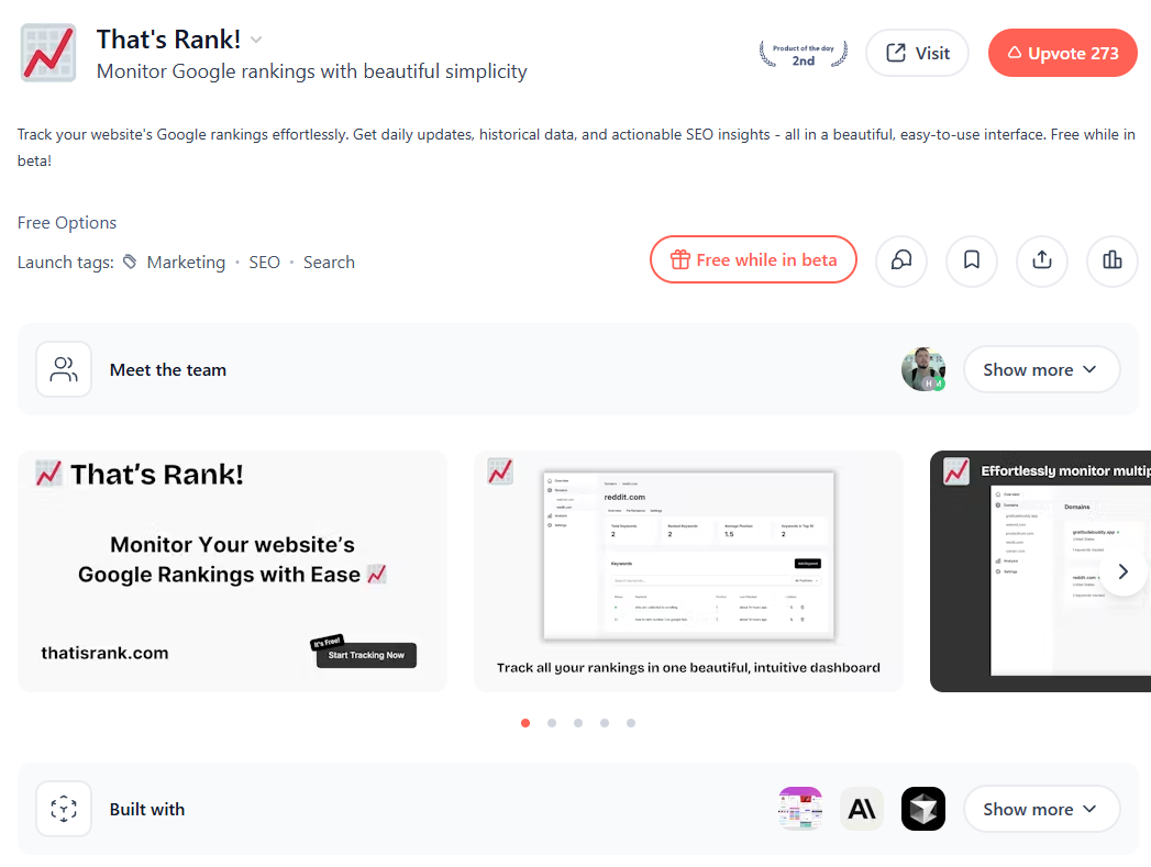 업보트 273개를 받아 데일리 리더보드 2위를 차지한 "That's Rank!" 상품의 소개 화면