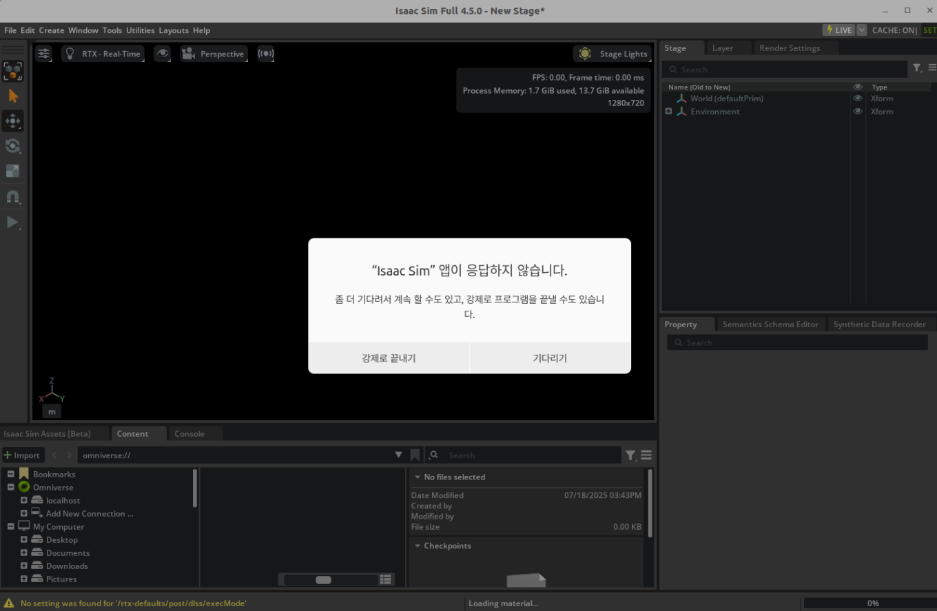- Isaac Sim 앱이 응답하지 않습니다. 팝업이 뜰 수 있습니다. 터미널에서 초기 로딩을 위한 내부 스크립트가 실행되고 있으니 기다리면 됩니다. (기다리기 버튼도 누르지 않아도 됨)